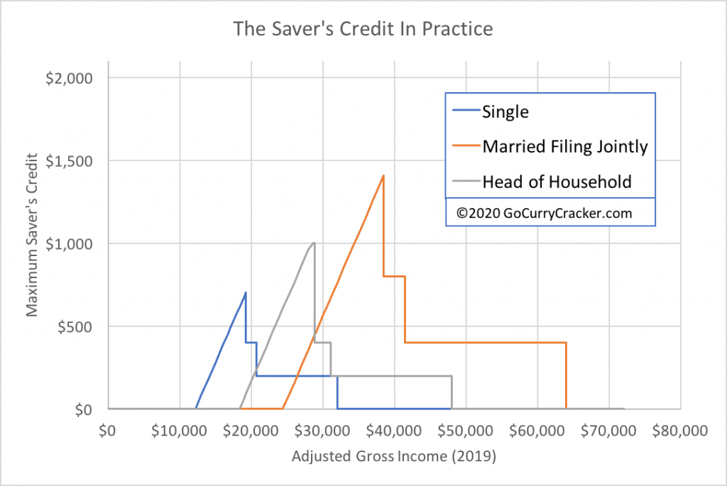 The Saver’s credit effectively eliminates all federal tax burden for incomes up to these thresholds, which is equivalent to increasing the standard deduction (aka the 0% tax bracket.) Instead of zero tax up to $24,400 for a married couple filing jointly, there is zero tax up to $38,499, for example.