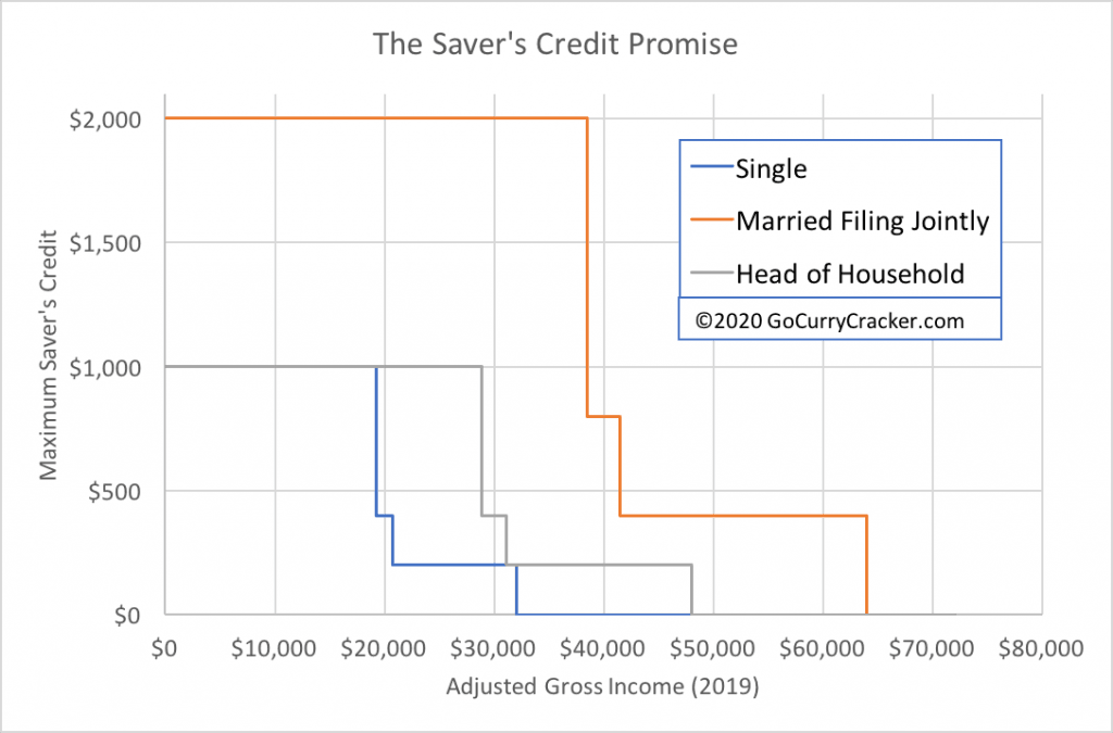 The Saver’s Credit offers great promise – contribute up to $2,000/person to a qualified retirement account and the IRS will reduce your taxes by up to $1,000. That is an immediate 50% return on investment!